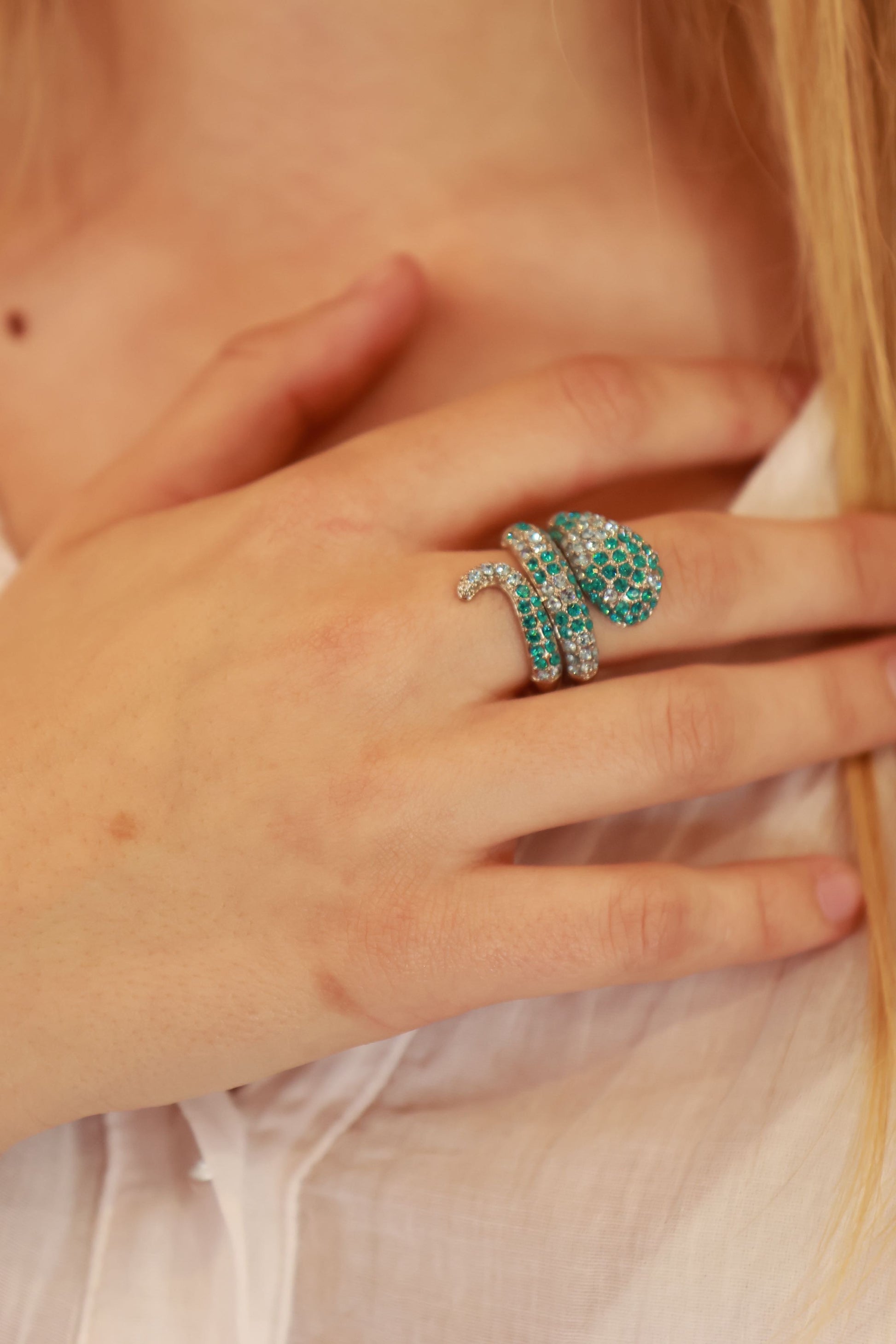 Envie d’un bijou qui hypnotise et libère ton côté sauvage ? La bague "Marina" signée Jade et Julie est une œuvre d’art à enrouler autour de ton doigt ! Inspirée d’un serpent majestueux, elle s’enlace gracieusement avec une forme sinueuse, sa tête ornée d’une explosion de cristaux turquoise éclatants et de strass blancs scintillants qui évoquent les profondeurs d’un océan scintillant. Les écailles, délicatement incrustées de pierres bleues et blanches, captent la lumière à chaque mouvement, tandis que sa base dorée apporte une touche chaleureuse et élégante.