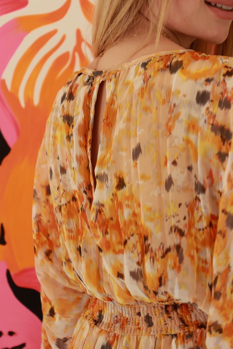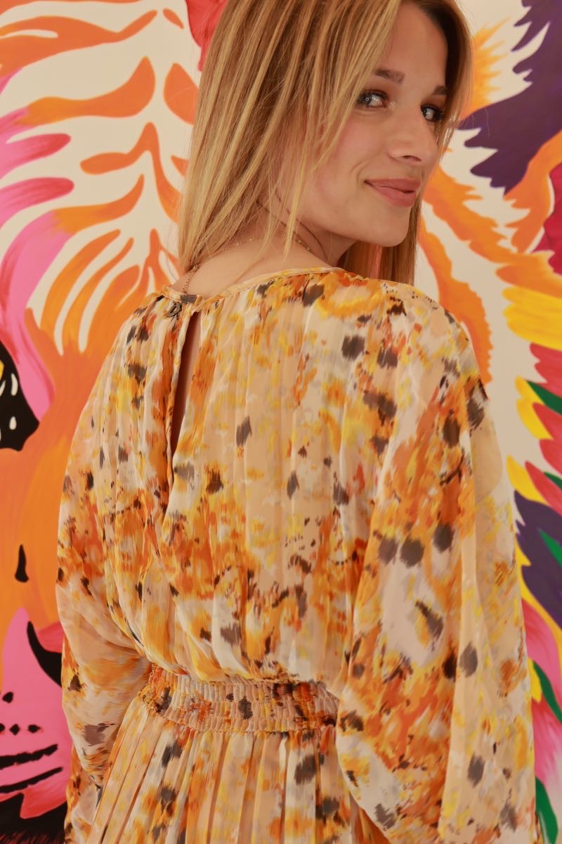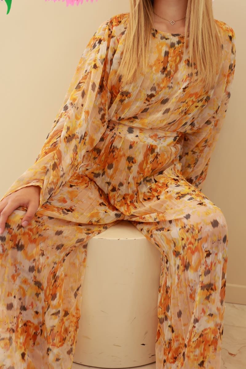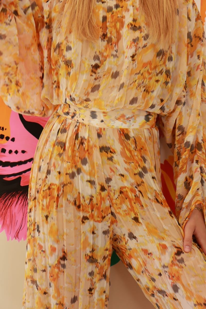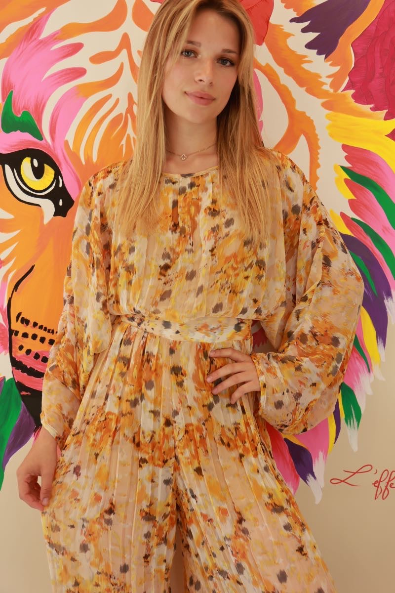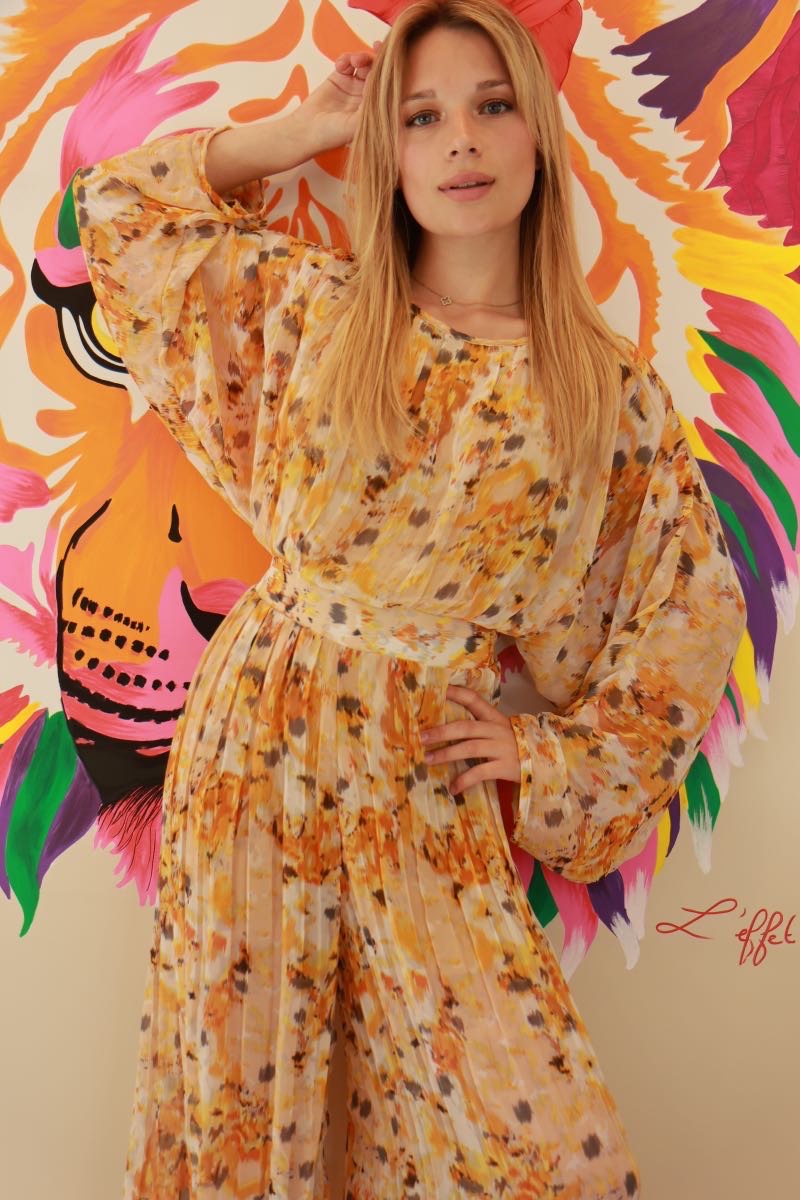 Cette combinaison signée Dixie, tout droit venue d’Italie, a tout pour faire tourner les têtes. Son imprimé fauve, entre jaune soleil et touches de rouille, booste l’allure en un clin d’œil. Coupe fluide, tissu léger, effet plissé ultra flatteur… et cette ceinture qui marque la taille comme il faut. En résumé ? Une pièce forte, comme on les aime chez La P’tite Rebelle.