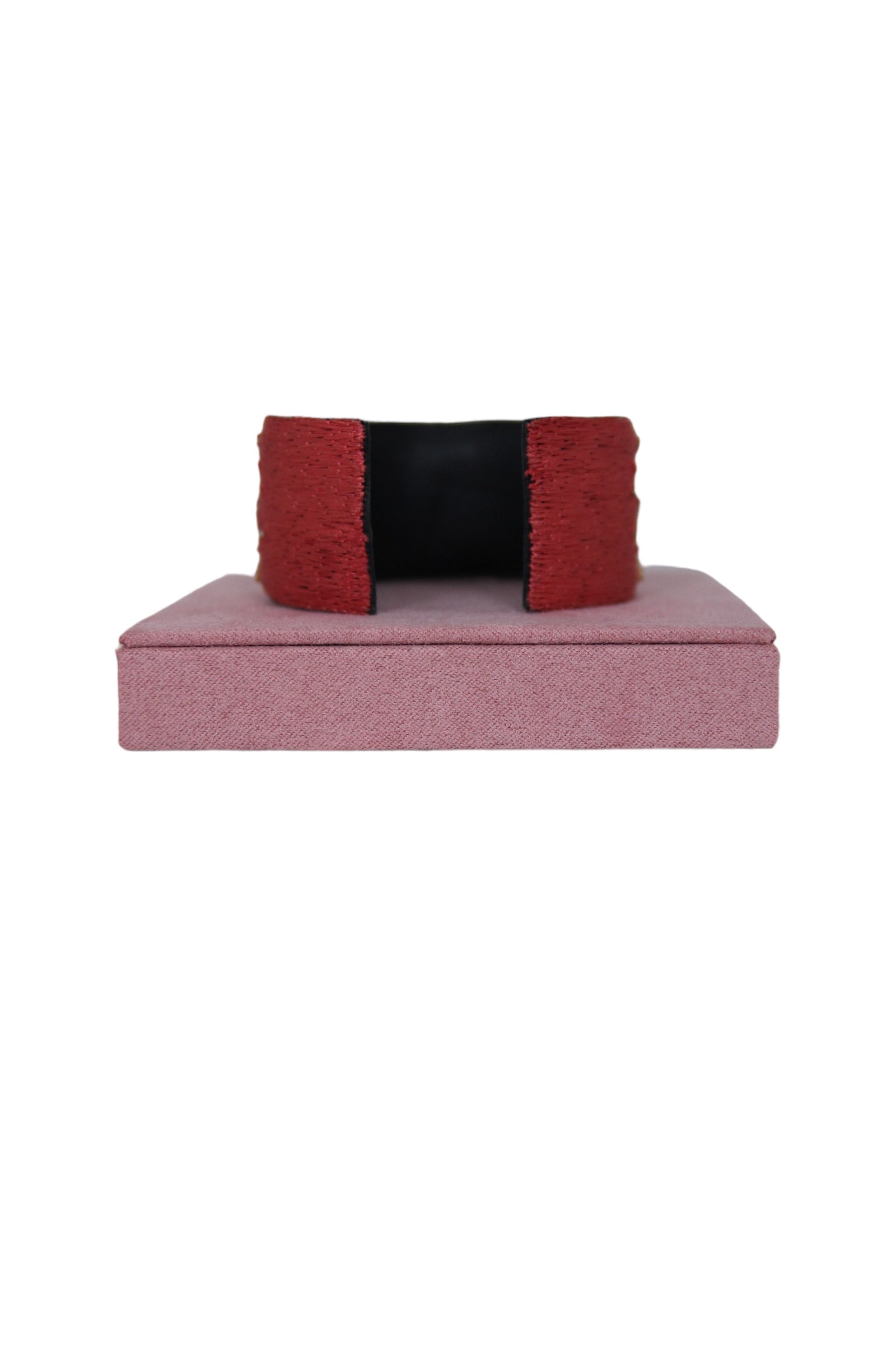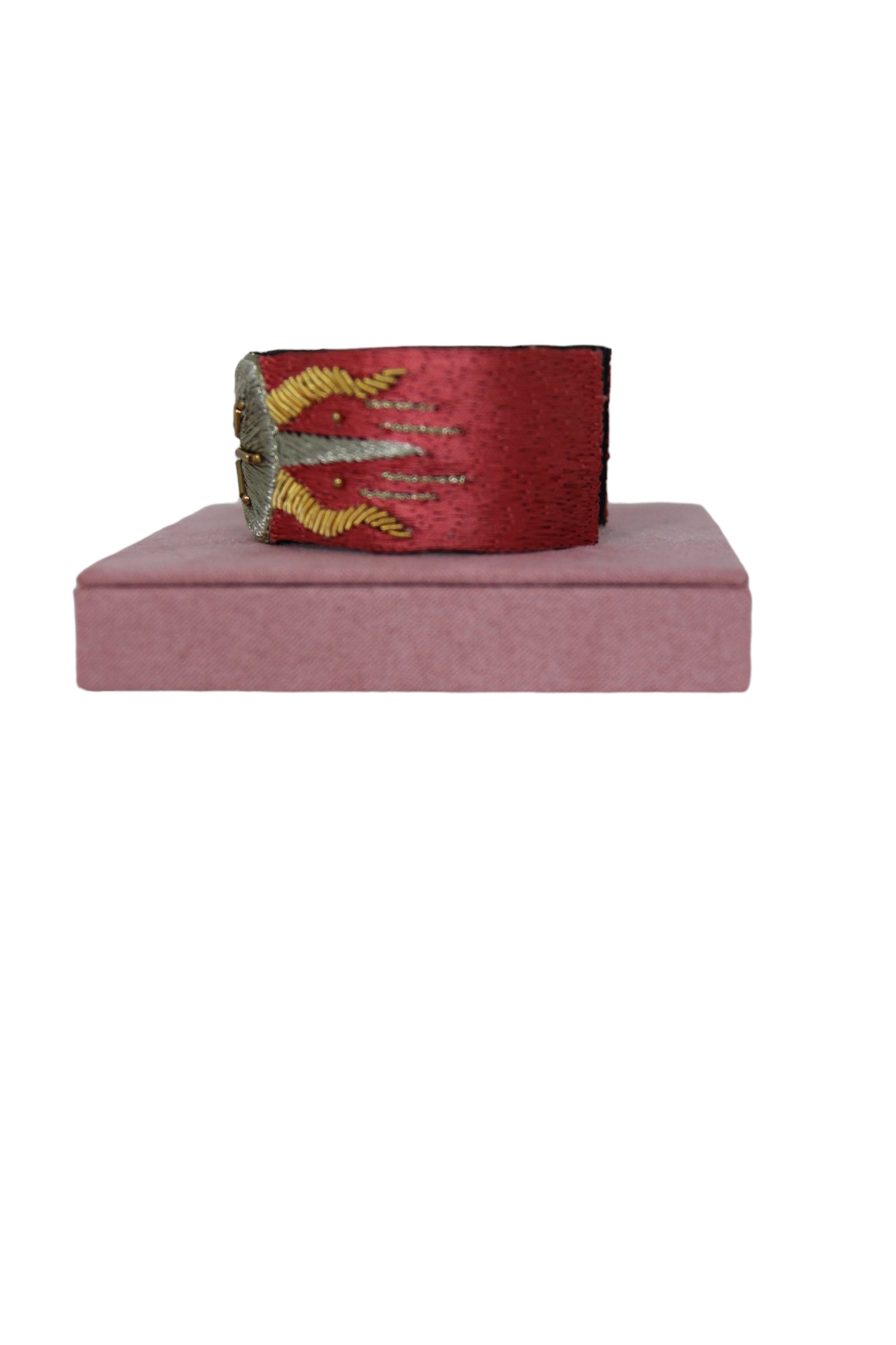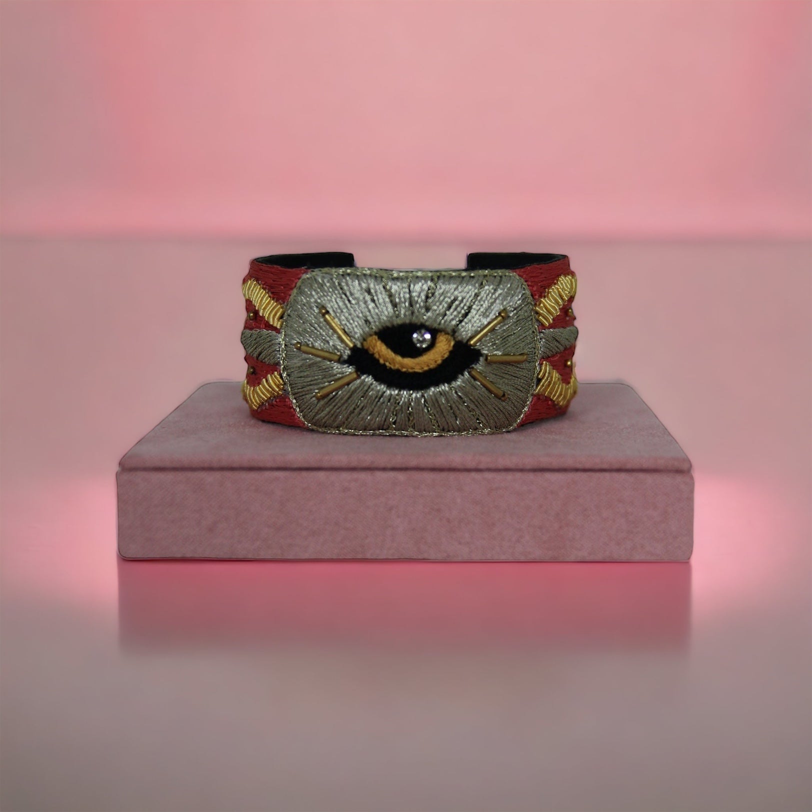 Bangle rigide bohème brodé à la main de fils de soie couleur rose-corail, or et beige. Doublure en cuir souple noir et attaches en laiton inoxydable.