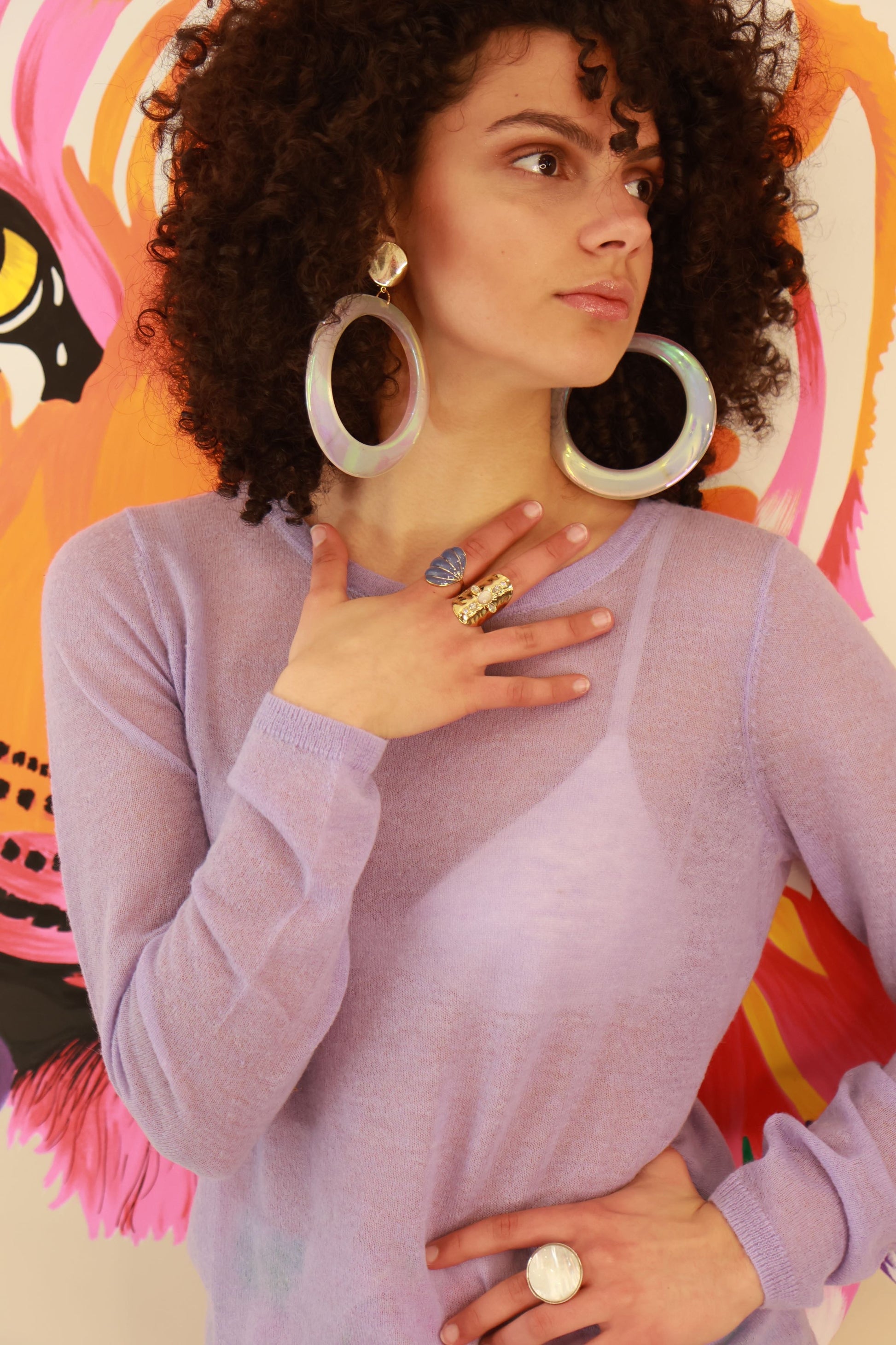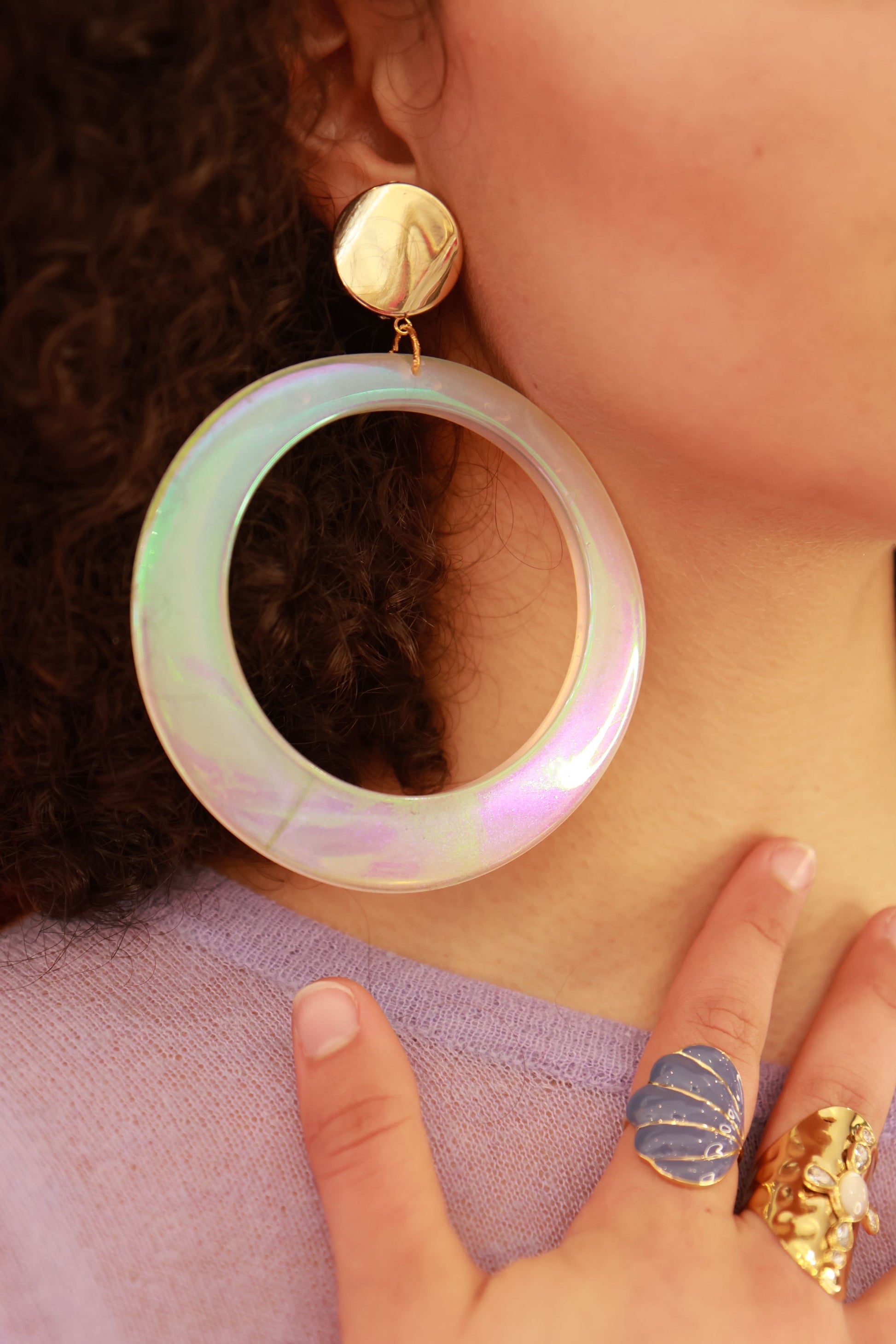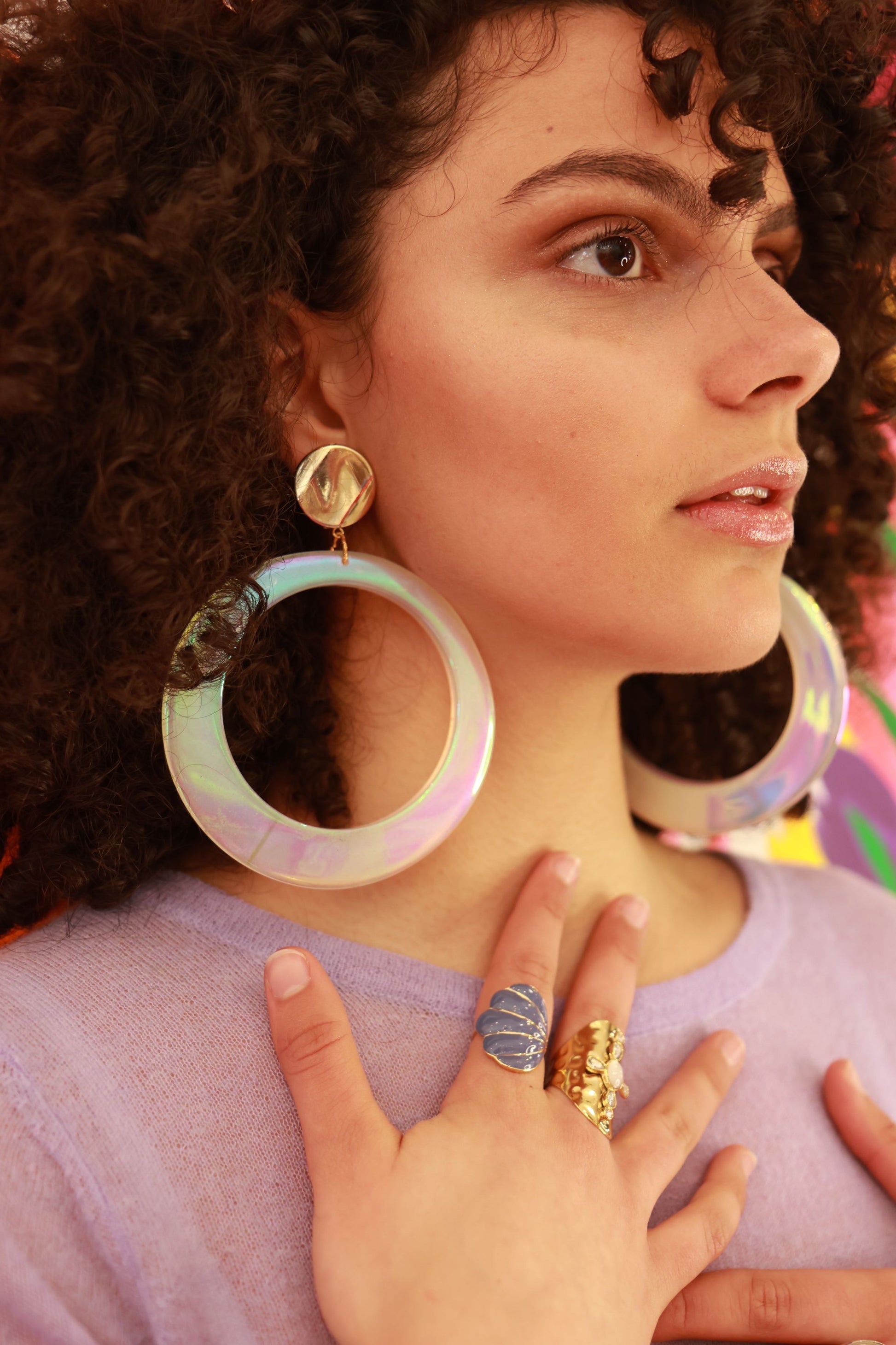 Prête à t’envoler vers les étoiles avec un style audacieux ? Les "Créoles lunaires" signées Marion Godart sont une invitation à rêver grand ! Ces grandes créoles en résine imposantes captent la lumière avec leur finition irisée, mêlant des reflets nacrés de blanc, de rose pâle et de bleu lunaire, évoquant un clair de lune scintillant. Leur large anneau, lisse et brillant, est suspendu à un disque doré satiné qui ajoute une touche d’élégance intemporelle.