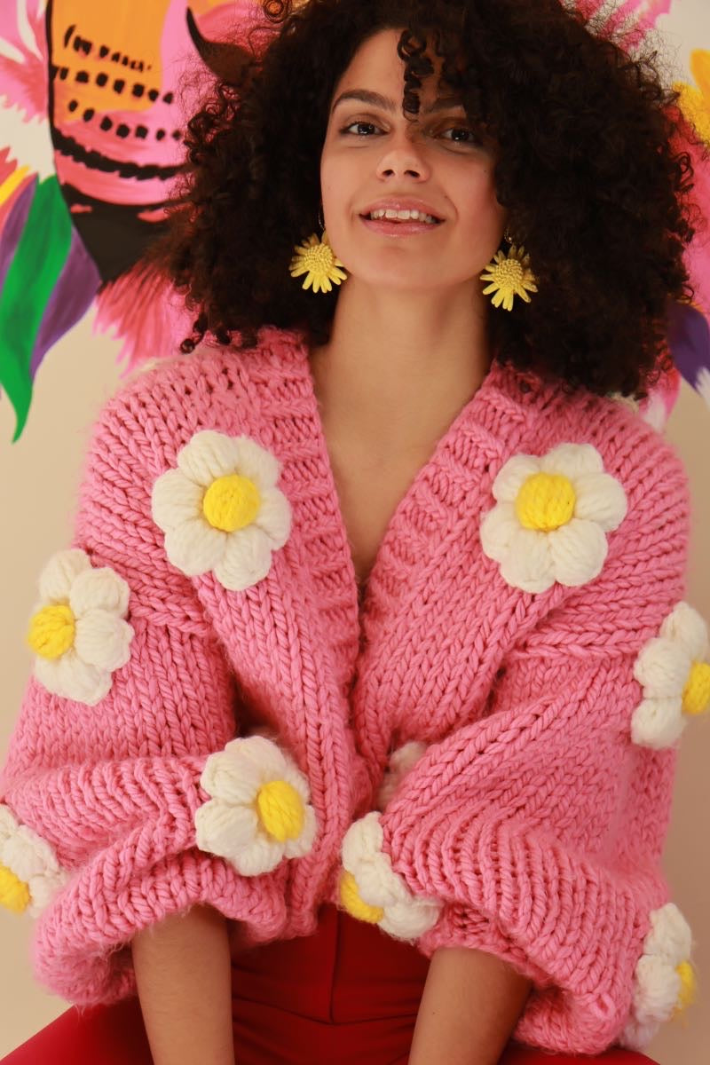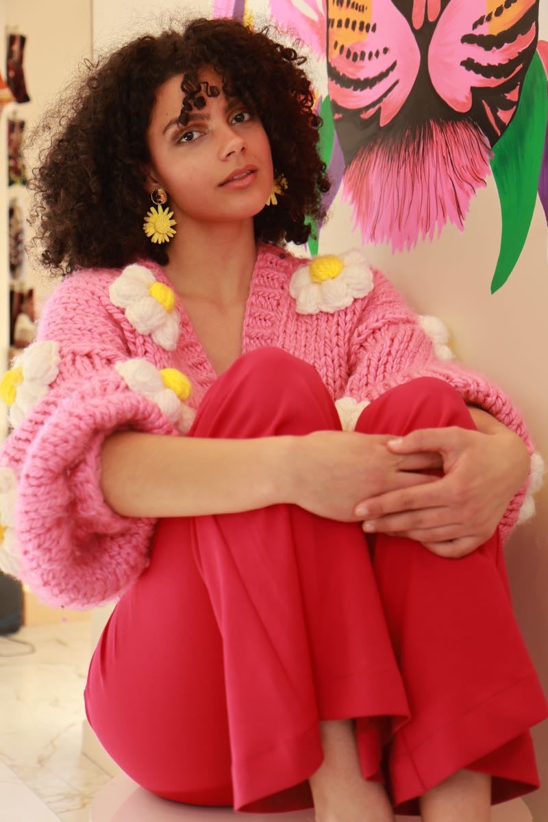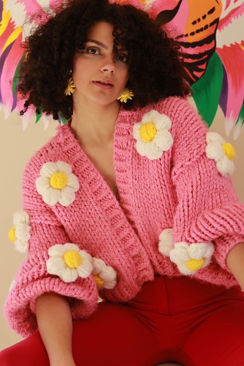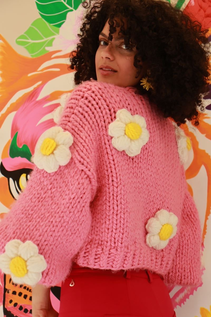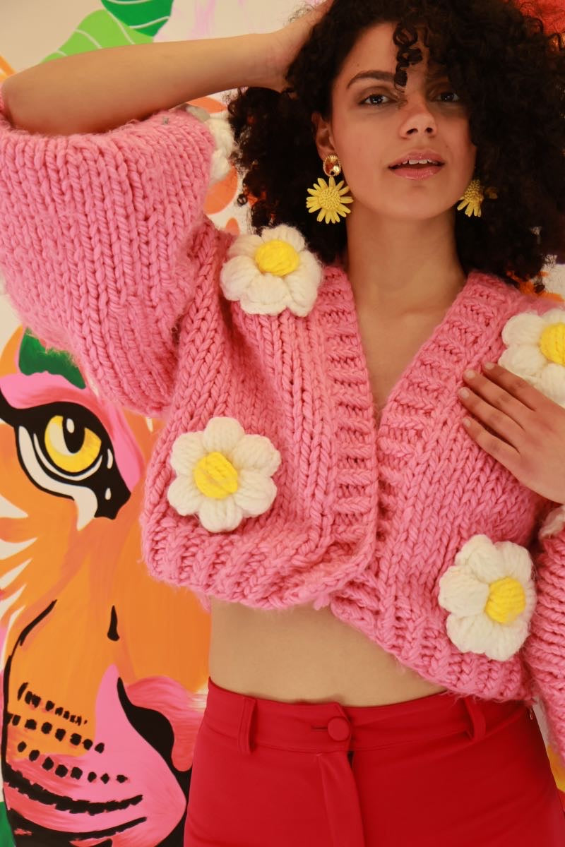 Gilet Créateur Seconde Main - Taille Unique – Rose Bonbon Volumineux Fleurs Tricotées