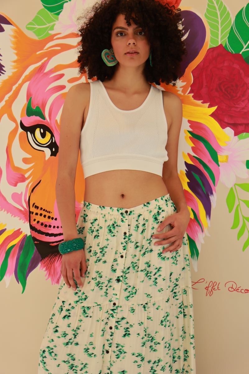 ✨ Comment la porter ? Avec un crop top blanc comme sur la photo pour l’été, ou un pull oversized et des boots pour l’automne. Ajoute un bijou coloré de notre sélection pour une touche rebelle !