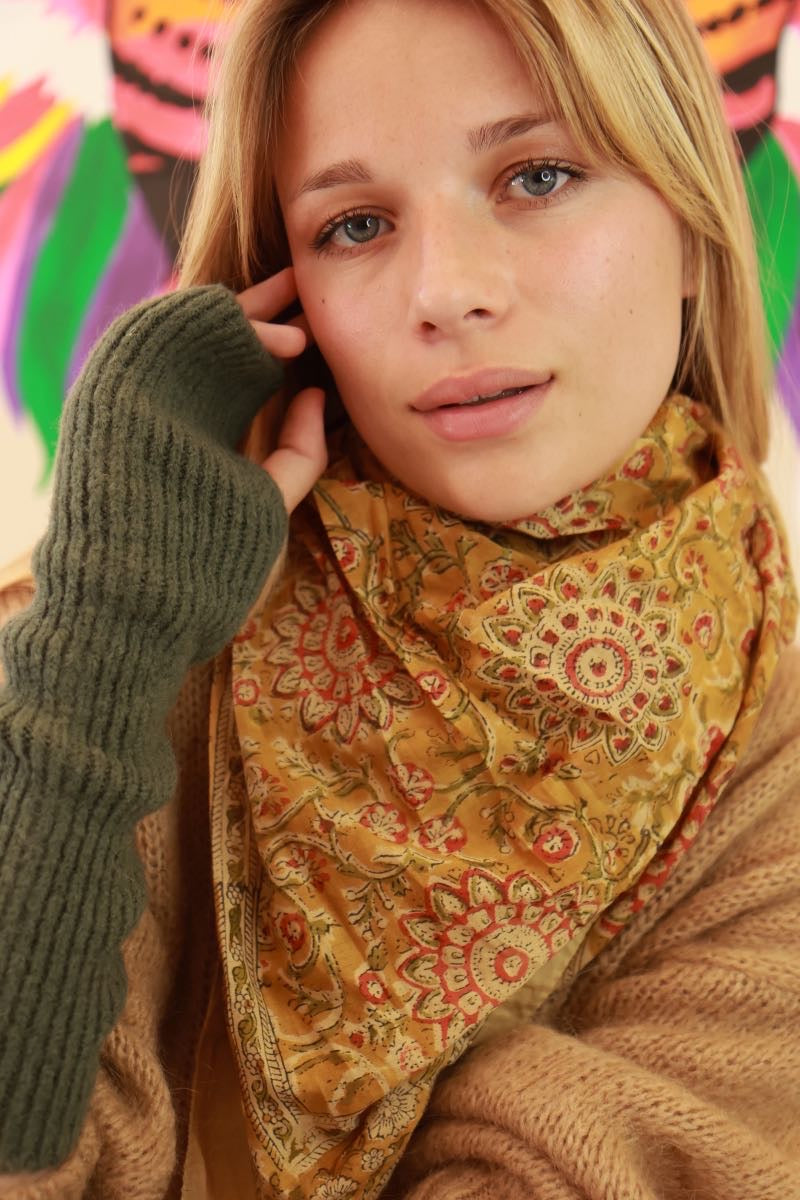 Le kaki, couleur intemporelle, évoque l'aventure tout en restant ancré dans l'élégance. Associées à d'autres pièces de notre collection de prêt-à-porter, ces mitaines créent une harmonie visuelle, soulignant votre sens du style distinctif.