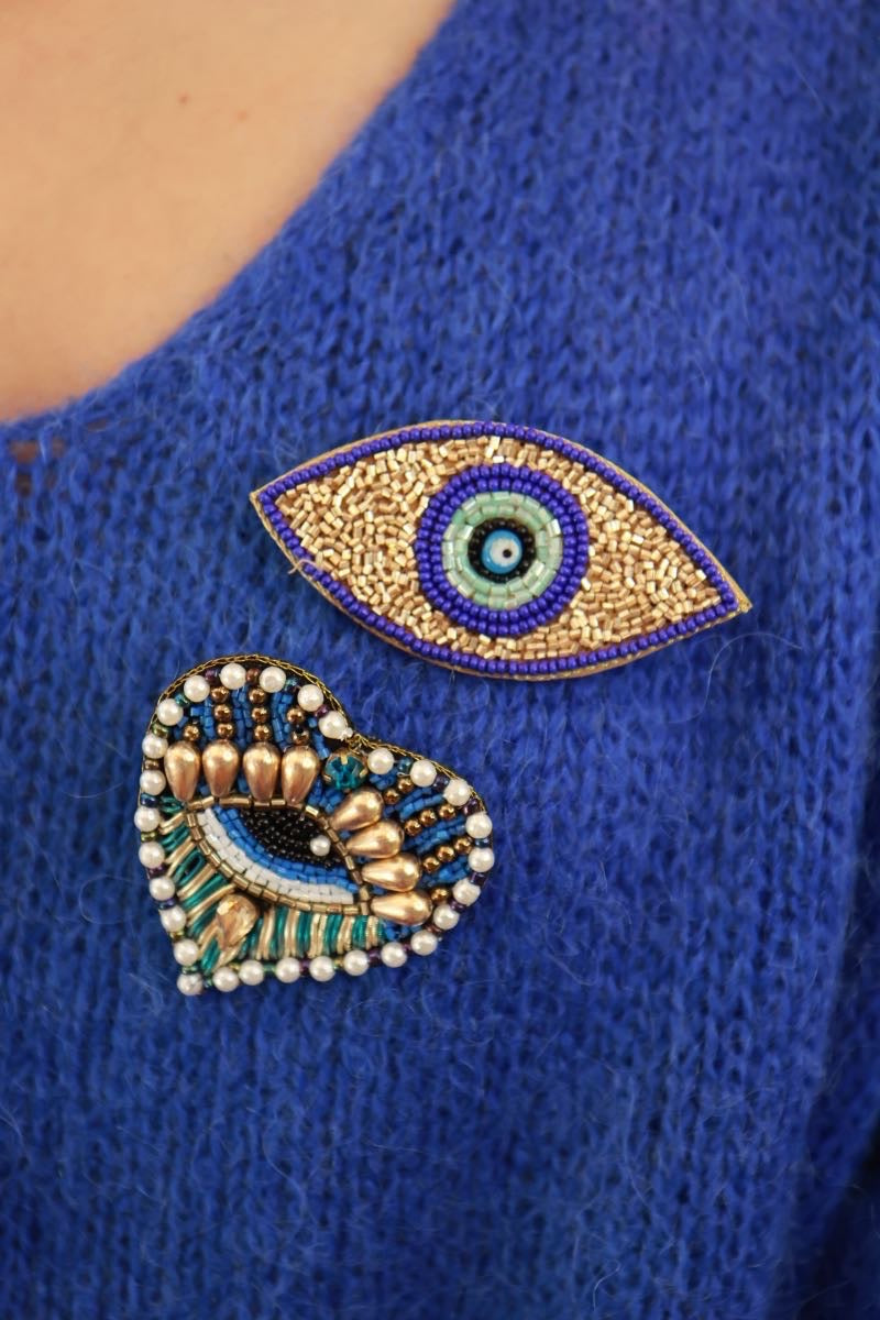 Apportez une touche de mystère et d’élégance à vos tenues avec cette broche mon œil by Jade et Julie, un accessoire captivant et unique. Cette broche représente un oeil, délicatement ornés de perles et de sequins dans des tons dorés, bleus et verts, offrant une fusion de symbolisme et de raffinement artisanal. Parfaite pour embellir un pull, une veste ou une écharpe, elle ajoute une note audacieuse et sophistiquée à votre style.