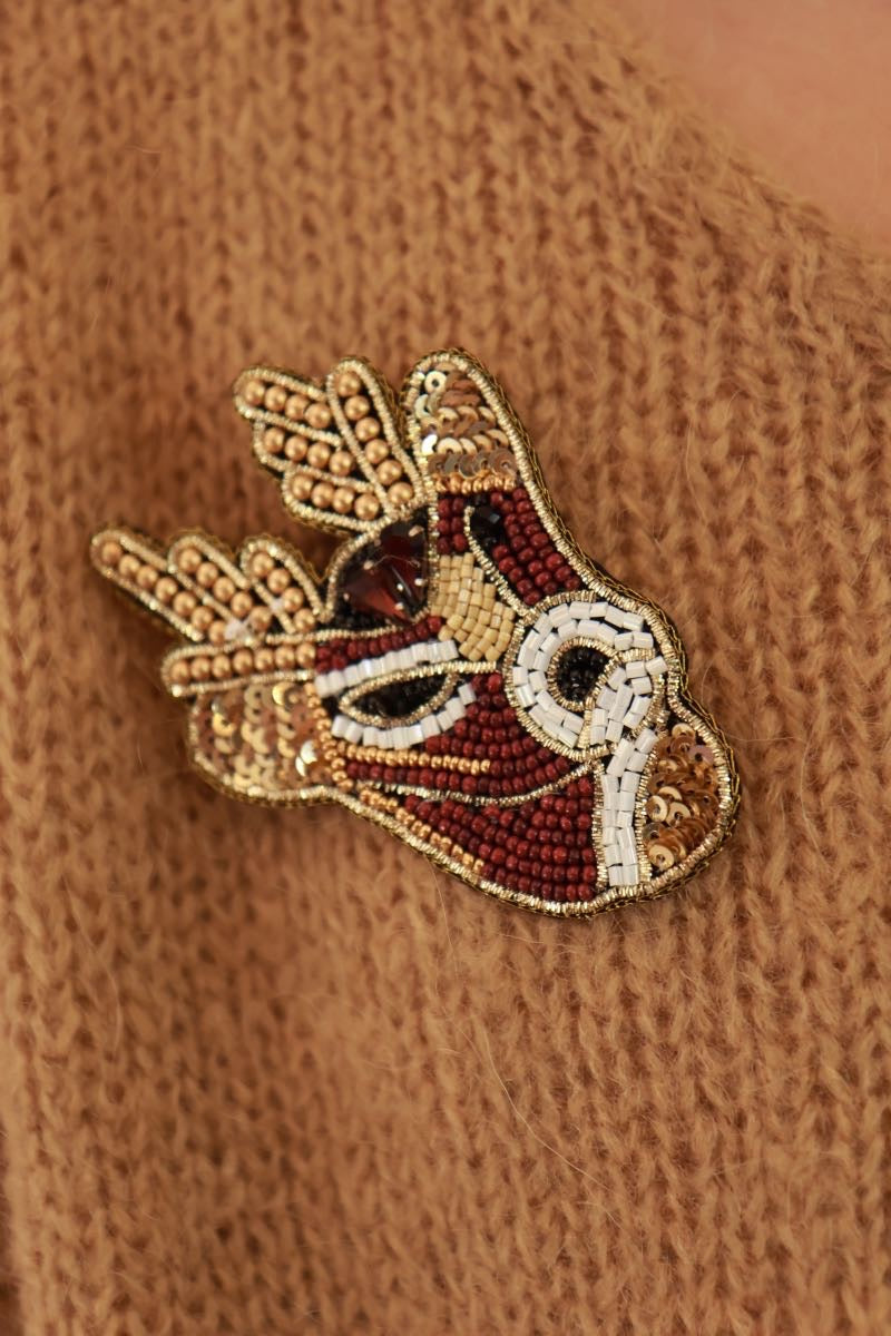 Apportez une touche de nature raffinée à vos tenues avec cette broche Mon P’tit Cerf by Jade et Julie, un accessoire élégant et original. Cette broche en forme de cerf, délicatement ornée de perles et de sequins dans des teintes rouges et dorées, mêle rusticité et sophistication avec une finition artisanale remarquable.