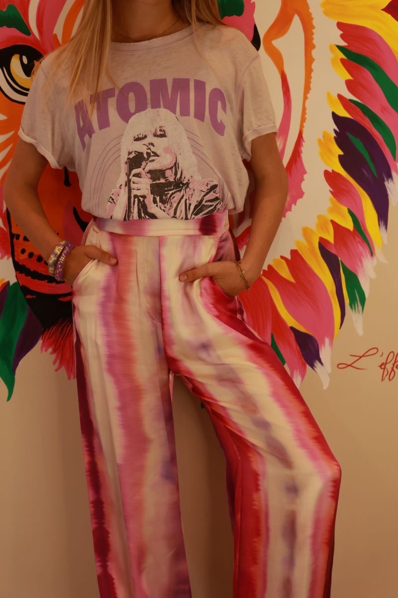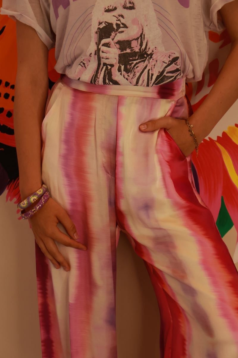 Prépare-toi à craquer pour ce pantalon Suncoo, une merveille de seconde main qui mêle audace et élégance avec brio ! En taille 1, il est taillé dans une viscose douce et fluide, sublimée par un magnifique effet tie and dye aux teintes rouges, roses et blanches qui dansent comme un coucher de soleil. Sa coupe palazzo, ample et aérienne, te donne une liberté de mouvement irrésistible, parfaite pour virevolter lors d’une journée ensoleillée ou d’une soirée entre amis.