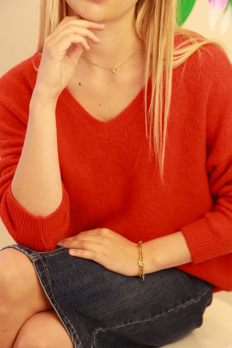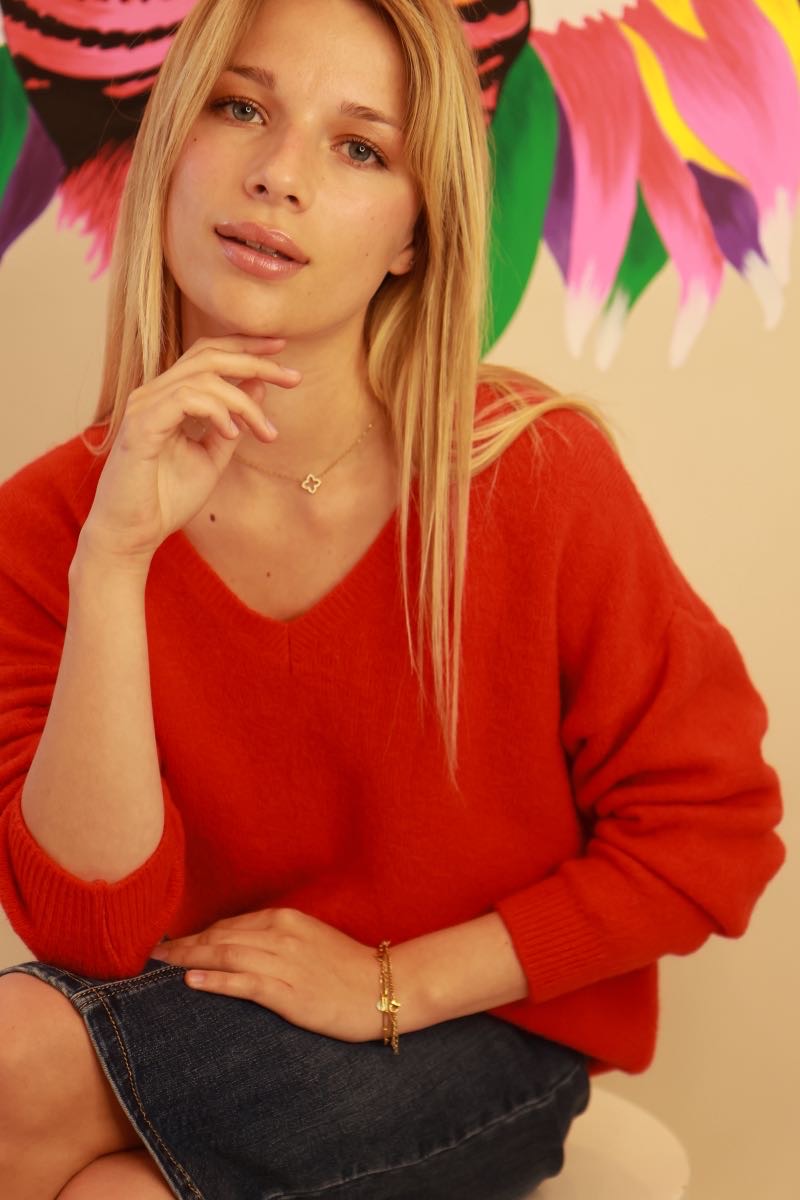 Envie de douceur et de couleur pour égayer tes journées ? Ce pull Andrea Marie Île de Ré est fait pour toi ! Tout neuf et disponible en taille unique, il t’enveloppe de sa laine moelleuse dans un rouge vibrant qui rappelle les couchers de soleil sur les plages de l’Île de Ré. Avec son col en V élégant et ses manches longues, il offre une coupe loose et confortable qui s’adapte à toutes les morphologies, parfaite pour cocooner avec style.