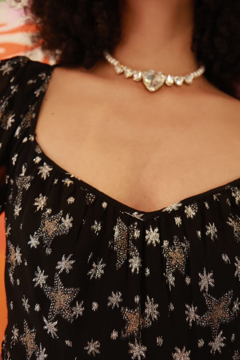 La robe Folie de Fabienne Chapot : élégante robe noire à motif d’étoiles dorées et argentées, doublée et fluide. Idéale pour cérémonies d’été ou soirées chics.