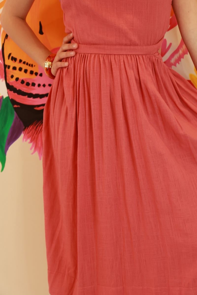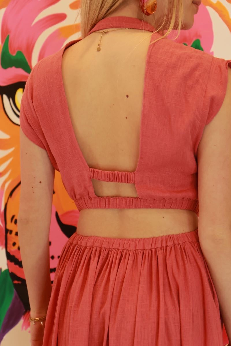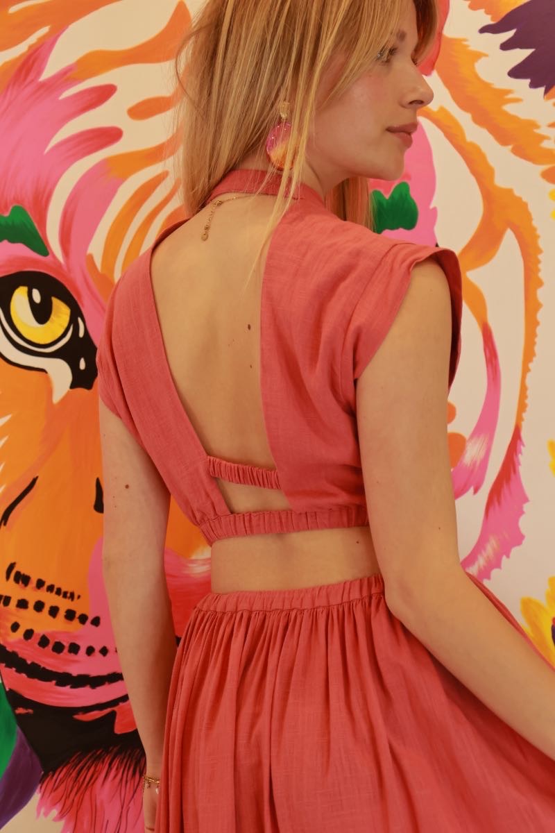 Confectionnée dans un mélange léger de lin et viscose, elle offre un tombé fluide et agréable à porter. Son tissu est doublé, pour un confort parfait et une belle tenue. Le dos est joliment ouvert et travaillé avec des bandes élastiques, pour une allure à la fois sensuelle et décontractée.