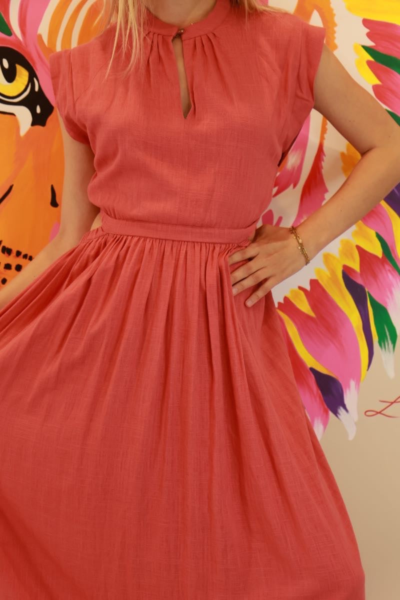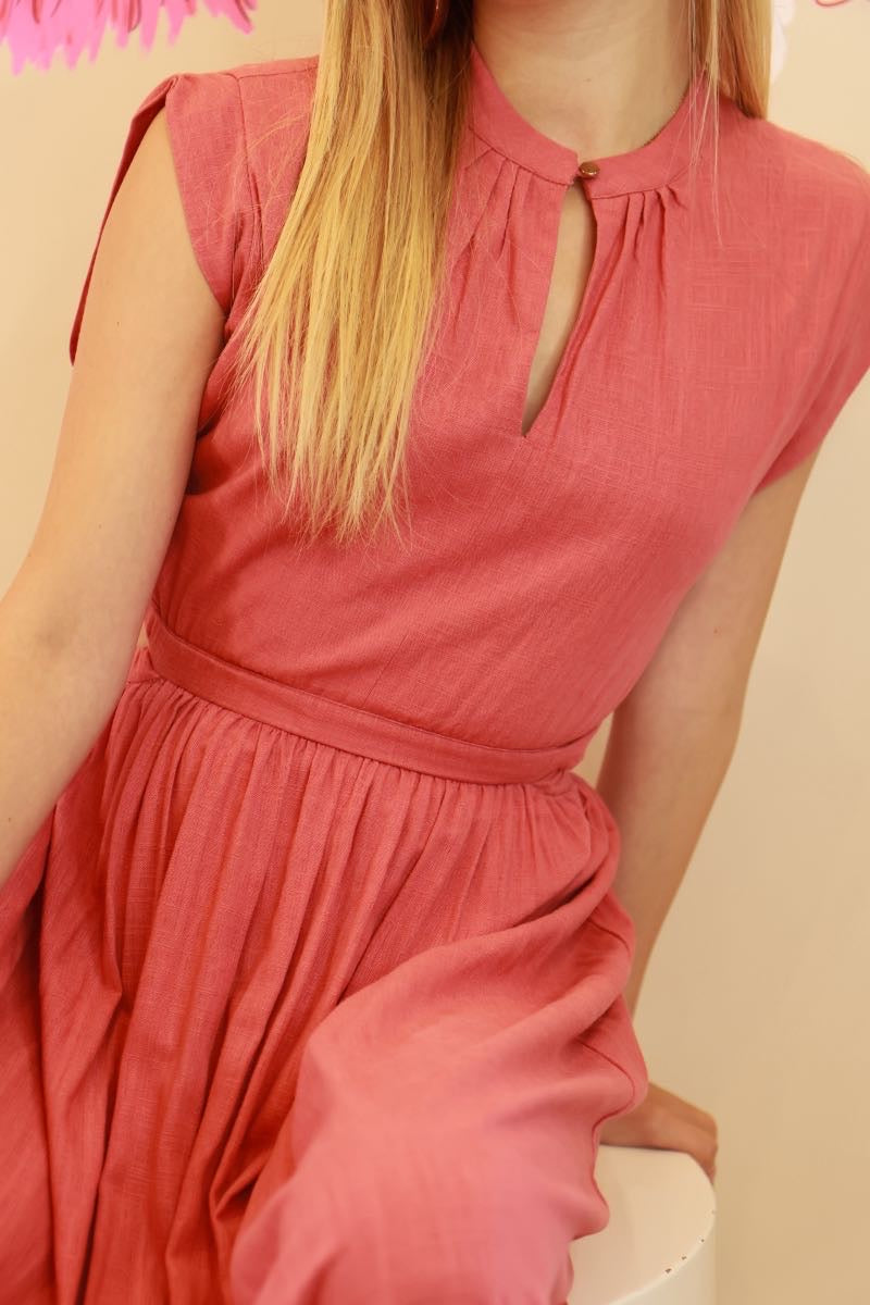 On aime particulièrement ses petites manches à revers, son encolure fendue devant qui allonge la silhouette, et sa taille marquée qui sublime les courbes tout en gardant un esprit libre et fluide. Un vrai coup de cœur pour les beaux jours !