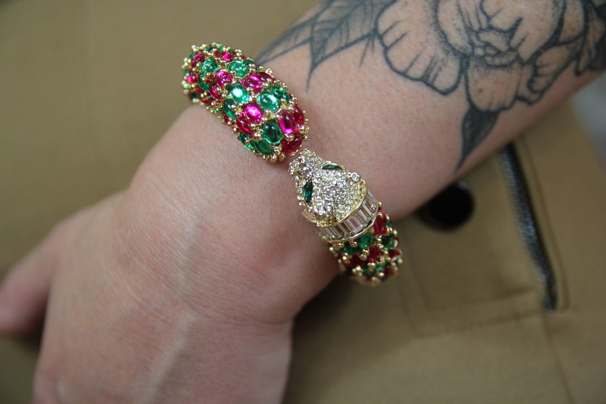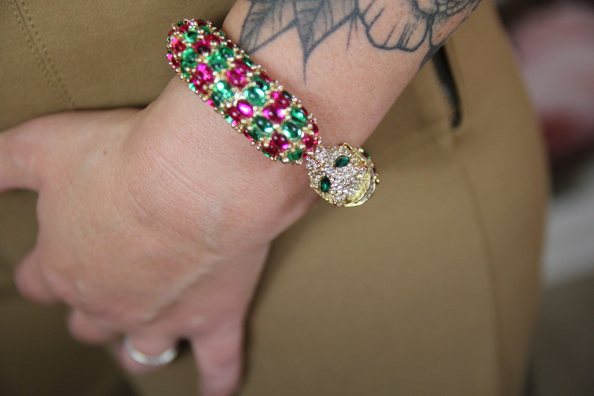 Un bracelet jonc entrouvert serti de cristaux et de résine verte et rose . Pour briller au quotidien ….
