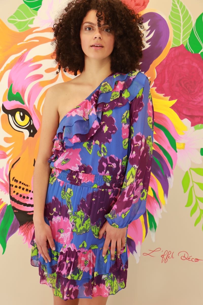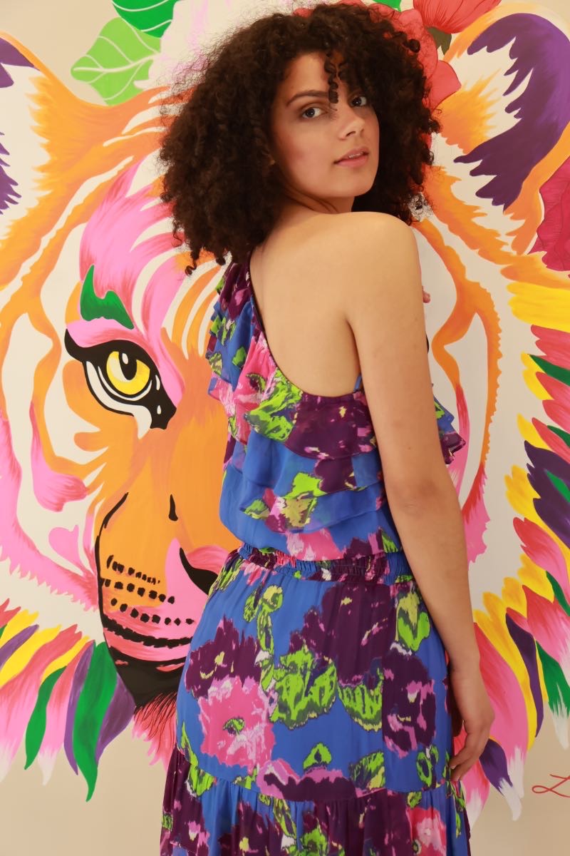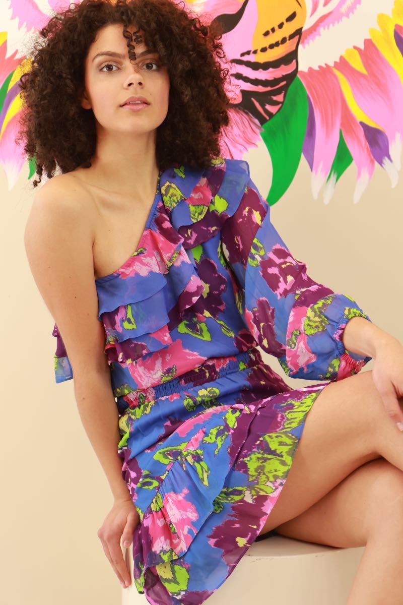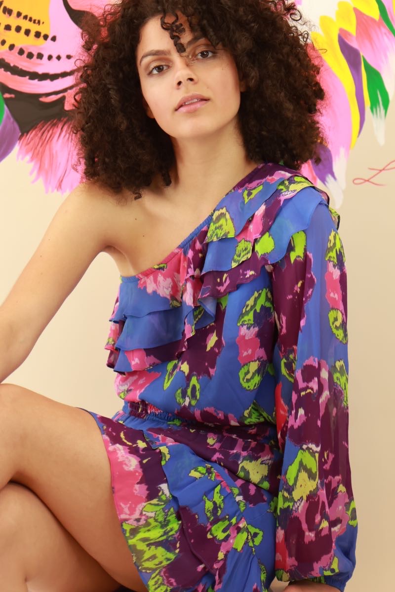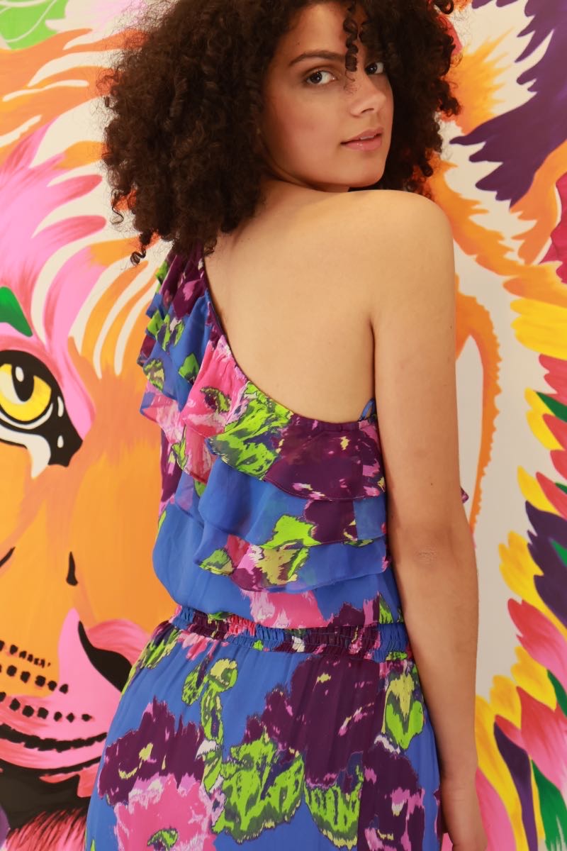 Une pièce forte qui ne laisse personne indifférent ! Cette blouse Alix The Label réinvente l’élégance avec son design asymétrique, son épaule dénudée et ses jolis volants. L’imprimé floral ultra coloré (fuchsia, violet, bleu intense, vert citron) booste instantanément n’importe quel look.