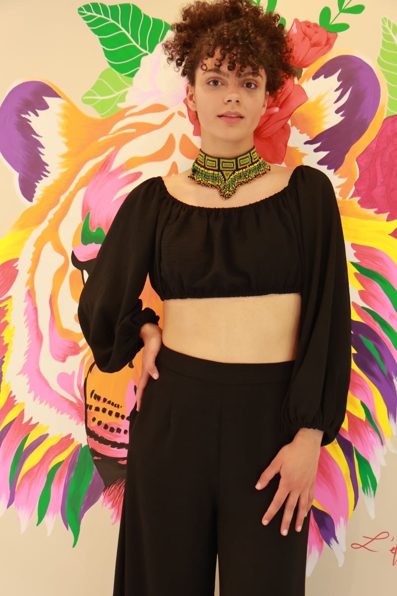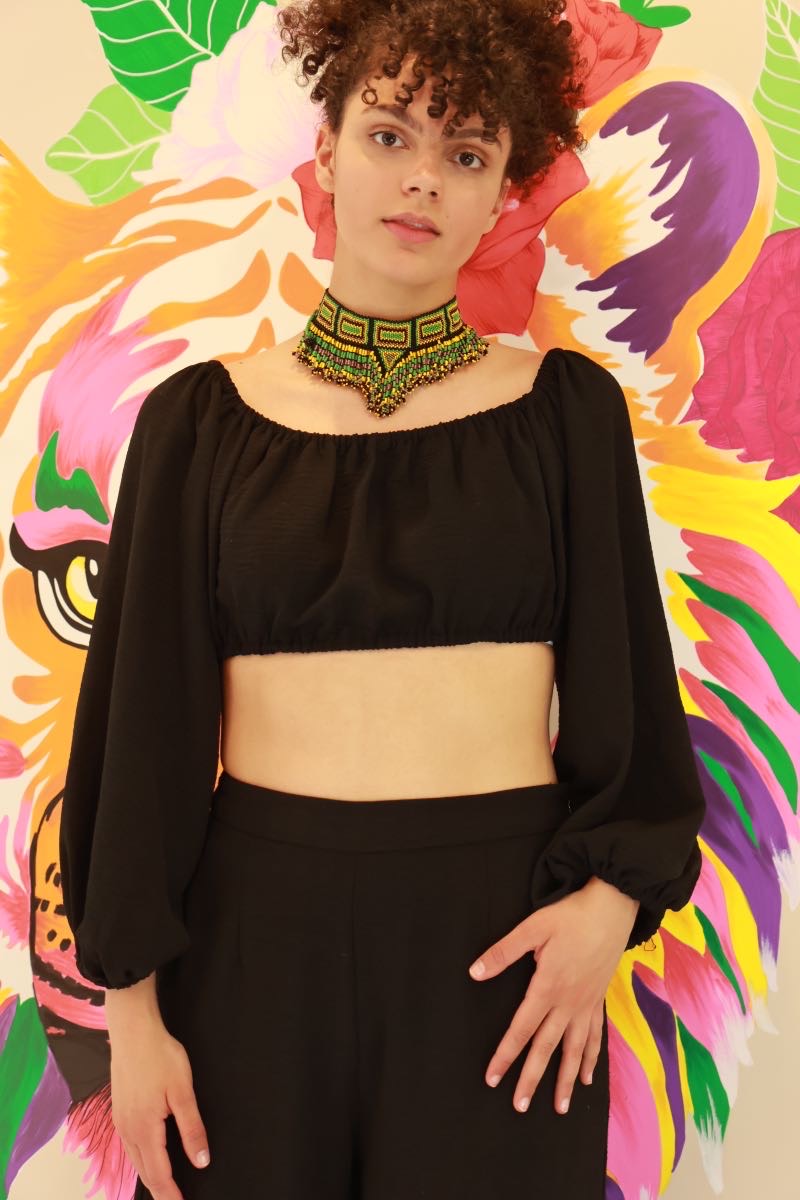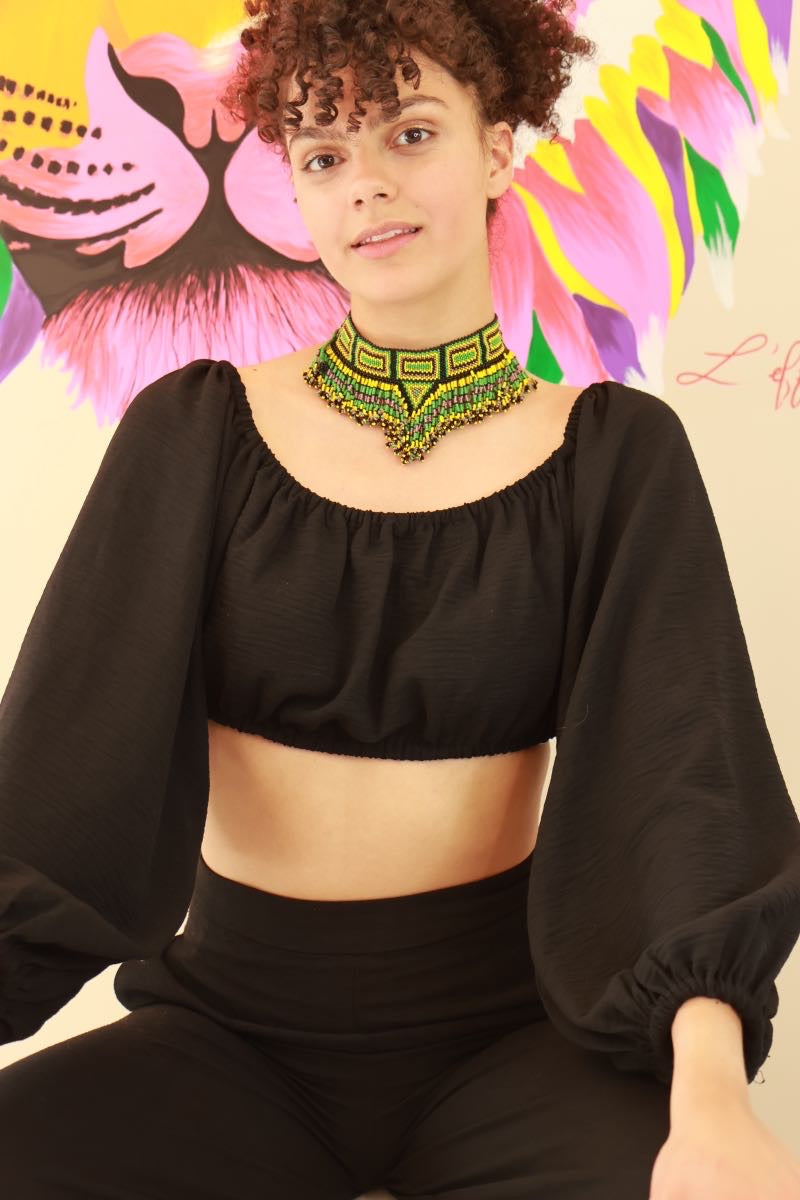 Avec sa coupe courte et ses manches longues ballon resserrées aux poignets, il met en valeur la silhouette tout en douceur. Son encolure élastiquée vous permet de le porter épaules nues pour un effet encore plus sensuel. Fluide, léger, mais avec de l’allure, ce top noir est le partenaire idéal de vos pantalons taille haute ou de vos jupes fittées.